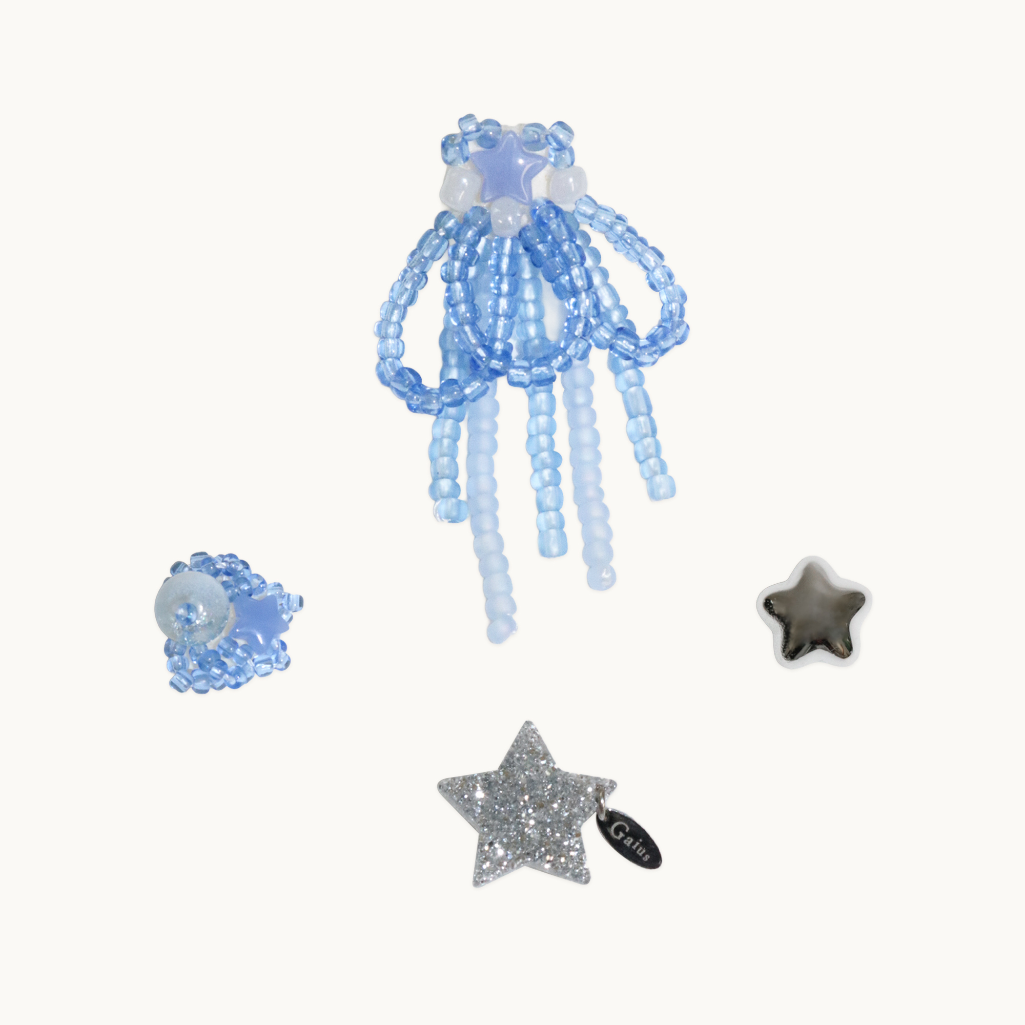 각기 다른 색을 띠는 하늘색 비즈를 늘어뜨려 떨어지는 별을 표현했습니다. 하늘색 수정과 별을 엮은 지비츠는 떨어지기 직전의 별은 어떨까 상상하며 만들었어요.