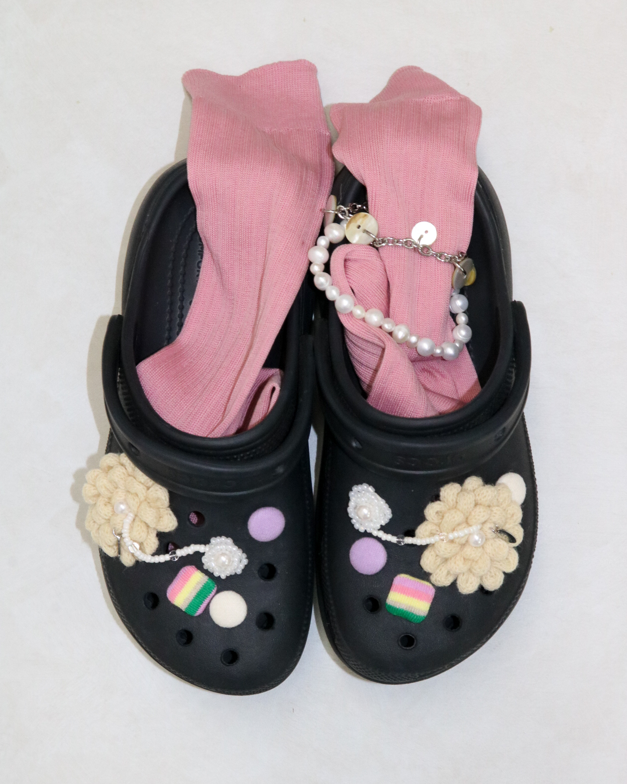 할머니 카디건에서 본 크로셰 꽃, 귀여운 싸개 단추, 진주 단추를 크록스에 옮겨놓았습니다. 포근하고 귀여운 할머니의 카디건을 닮은 슈참은 당신의 발끝에 기분 좋은 포인트가 될 거예요.