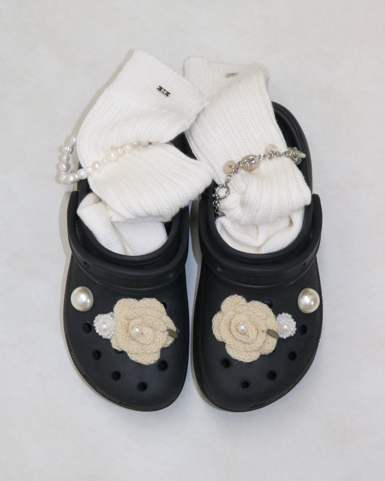 할머니 카디건에서 본 크로셰 꽃, 정제된 아름다움이 담긴 진주 단추를 크록스 위로 옮겼습니다. 귀여움과 동시에 정제된 아름다움을 지닌 pearl button shoe charm 당신의 발끝에 기분 좋은 포인트가 될 거예요.