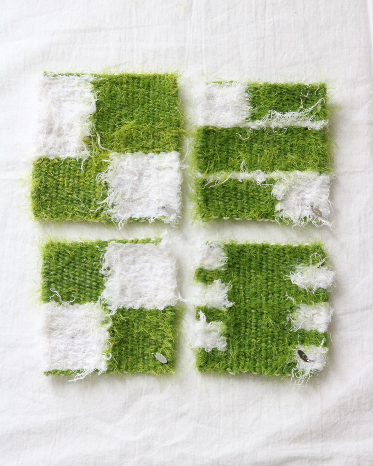 초록색, 흰색 실 모두 헤어리한 실을 사용해 서로 다른 색의 경계가 자연스럽게 허물어져 보이도록 제작했습니다. 우리 마음속에 녹아든 초록을 생각하면서요.