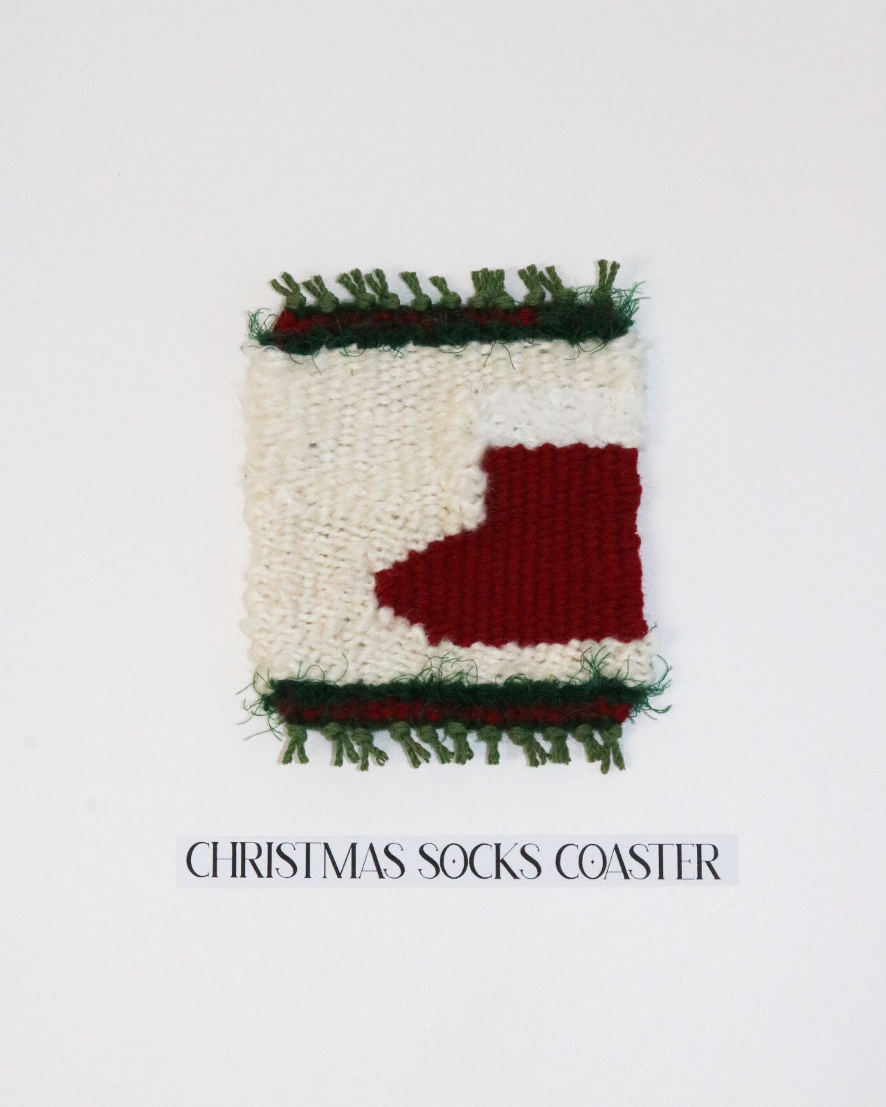 *Details 컬이 들어간 아이보리 색 실을 메인 실로 엮어 크리스마스가 주는 따뜻한 분위기를 극대화했습니다. 중앙이 아닌 사이드에 빨간 털 양말을 배치해 귀여움을 더했고요. 크리스마스 하면 떠오르는 색인 초록색과 빨간색으로 코스터를 마무리했습니다.