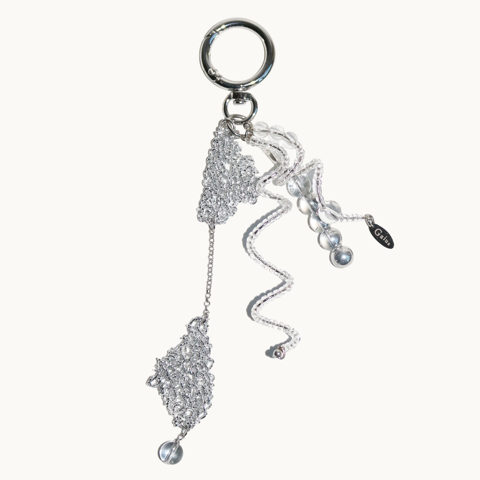 반짝이는 윤슬을 뜨개로 형상화한 조각들을 이어 만든 키링입니다. 일렁이는 물결 위로 내려앉은 빛을 어떻게 표현할 수 있을까 고민하며 고른 유리구슬과 물결을 표현하고자 꼬임을 준 비즈 막대가 어우러져 낮이든 밤이든 반짝일 거예요. 윤슬 조각이라는 이름답게 빛을 받으면 더 황홀하게 반짝입니다.
