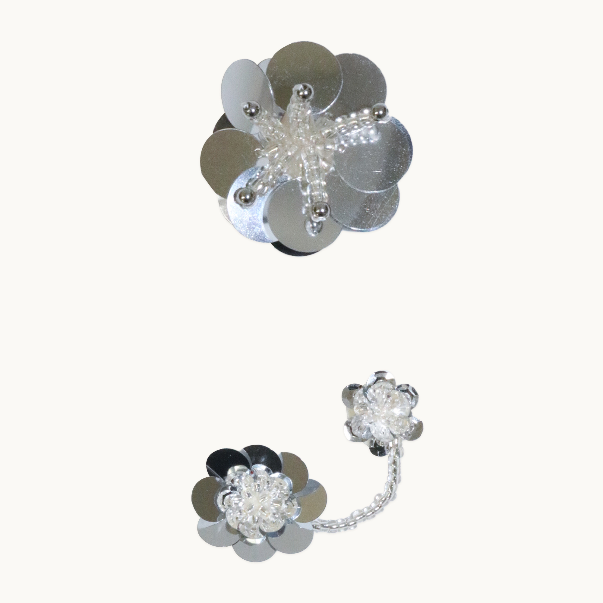 큰 꽃은 비즈로 수술을 표현해 더욱 반짝이며, 작은 꽃과 꽃은 꽃에 맺힌 물방울을 표현한 비즈로 이어져 아름다운 존재감을 가지고 있습니다. 두 개의 꽃이 비즈로 이어져있기 때문에 거리에 따라 자유롭게 연출할 수 있어요.