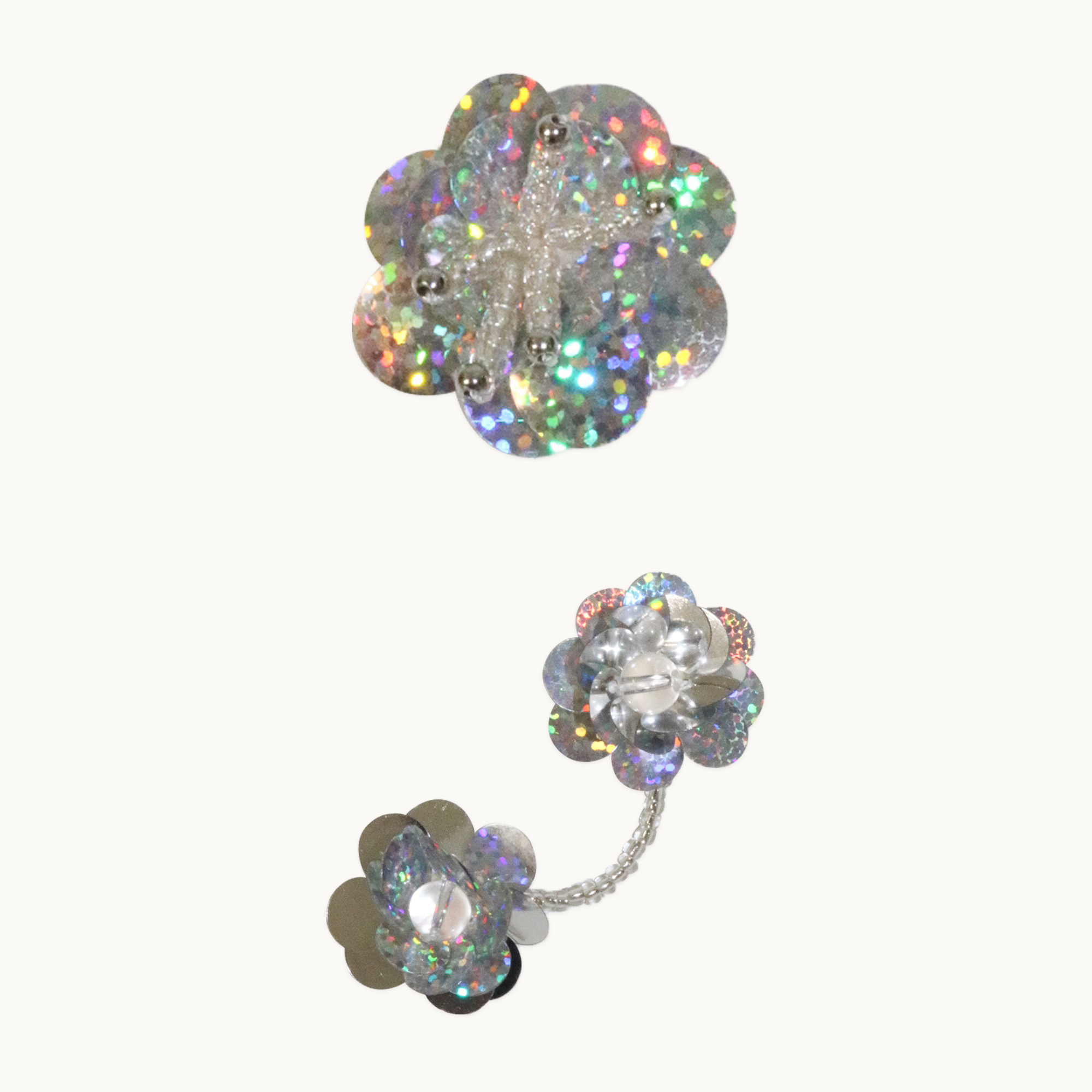 큰 꽃은 비즈로 수술을 표현해 더욱 반짝이며, 작은 꽃과 꽃은 꽃에 맺힌 물방울을 표현한 비즈로 이어져 아름다운 존재감을 가지고 있습니다. 두 개의 꽃이 비즈로 이어져있기 때문에 거리에 따라 자유롭게 연출할 수 있어요.